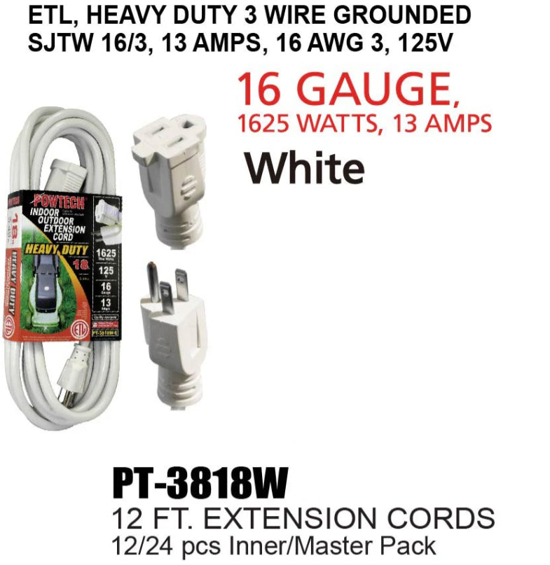 18' PowTech Heavy Duty Extension Cord 16/3 13A 125V - PT-3818W