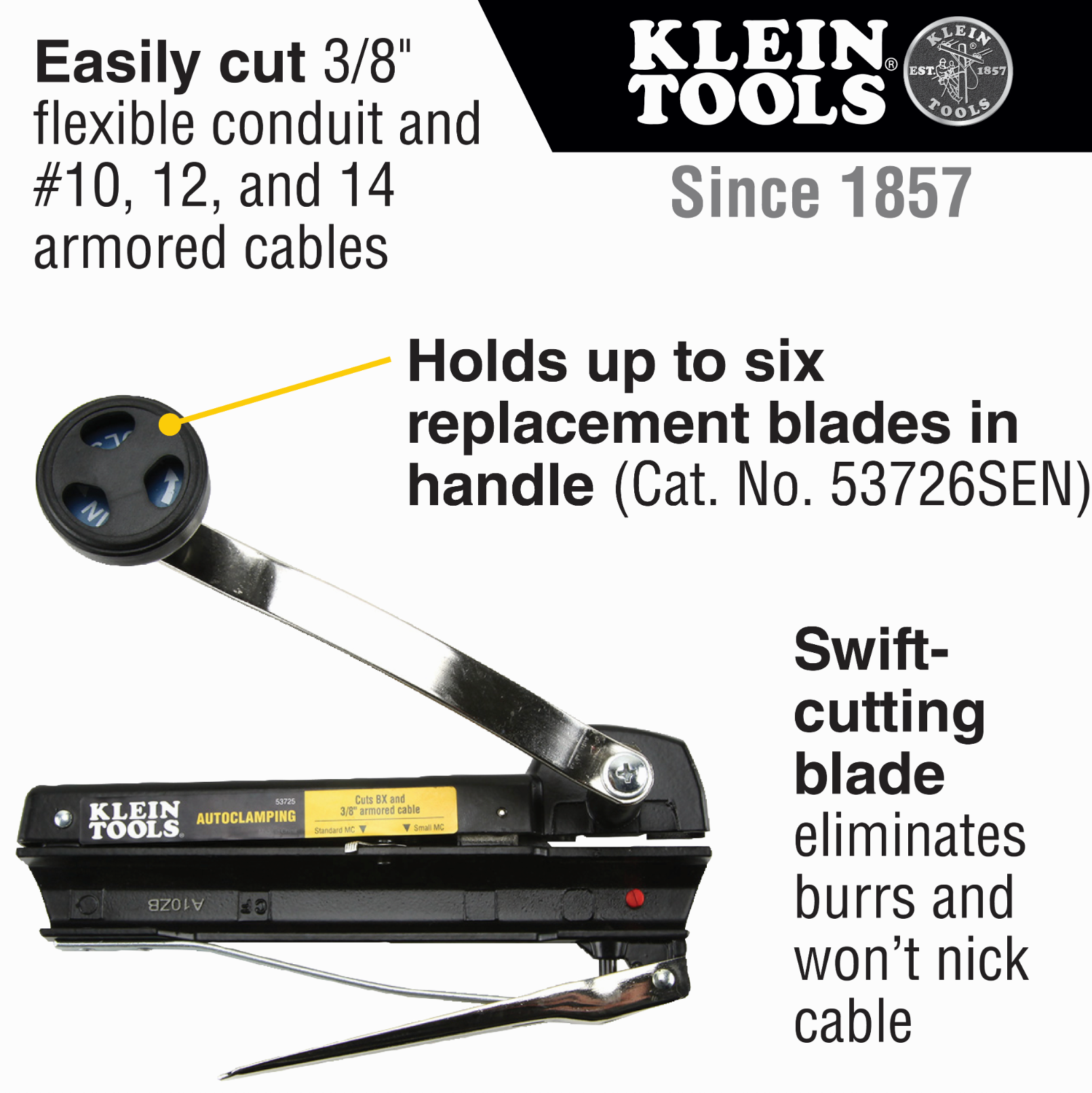 Designed for convenience, the cutter stores one spare blade in the handle and can hold up to six replacement blades (sold separately, Cat. No. 53726SEN). Built tough for electricians who demand precision and efficiency.