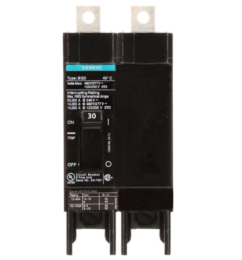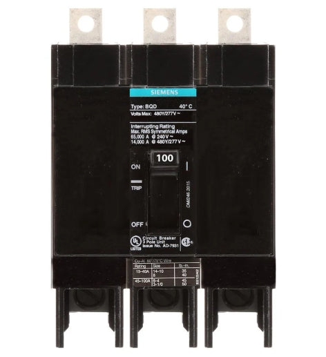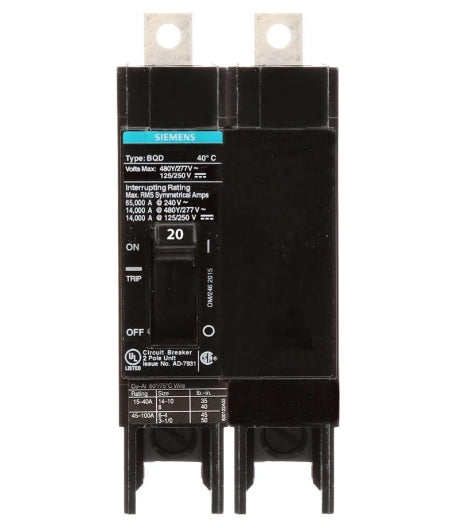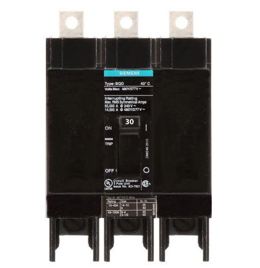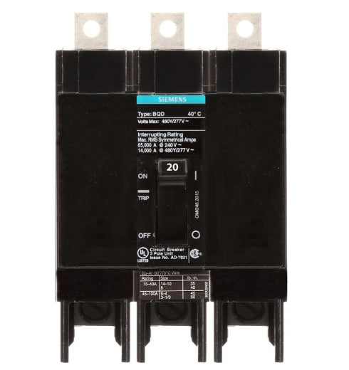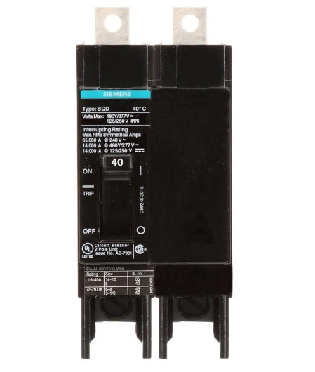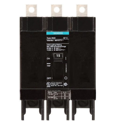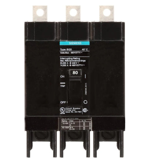 The Siemens BQD Series offers a comprehensive range of bolt-on molded case circuit breakers, designed for robust overcurrent and short-circuit protection in demanding electrical systems. Available in 1-pole, 2-pole, and 3-pole configurations with ampere ratings from 15A to 100A, these breakers feature a 480V maximum voltage rating and an impressive 65kA interrupting capacity at 240VAC.