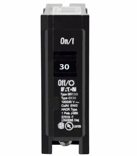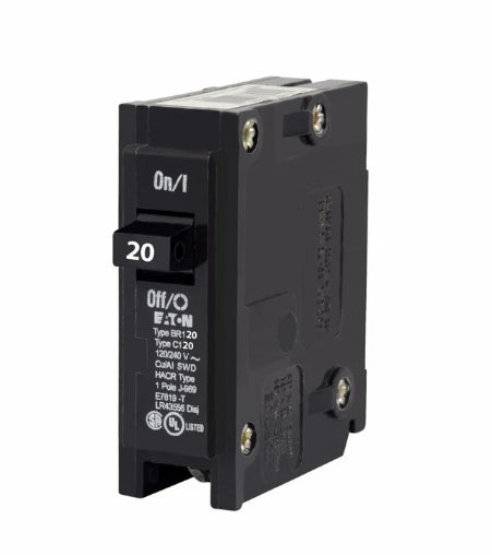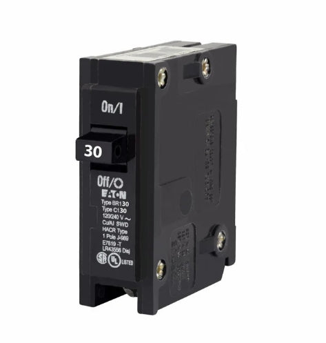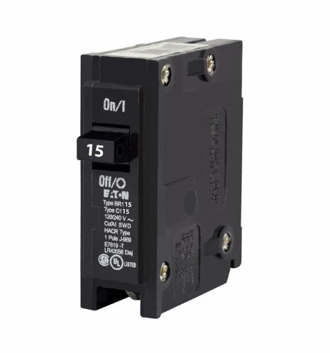 The Eaton BR Series offers 1-pole plug-in circuit breakers in 15A (BR115), 20A (BR120), and 30A (BR130) configurations. These UL Listed & CSA Approved breakers provide thermal-magnetic protection for Eaton, Cutler-Hammer, Bryant, and compatible load centers.