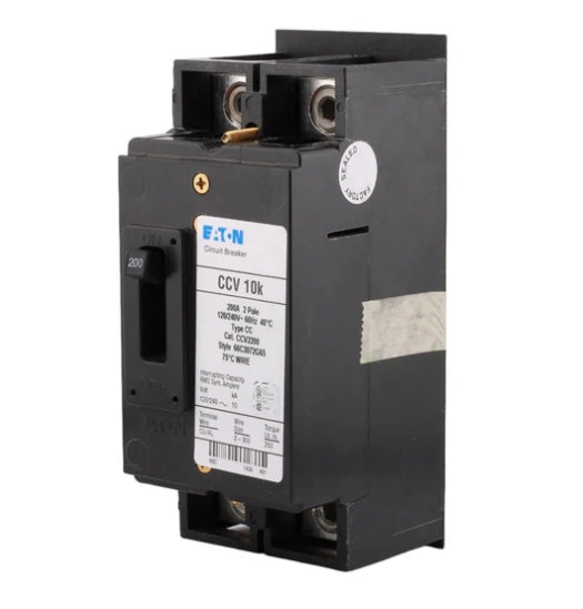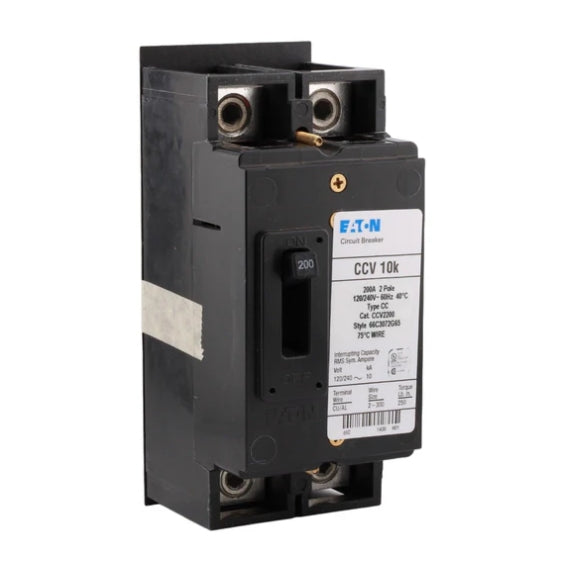 The Eaton CCV Series offers 2-pole thermal-magnetic breakers in 150A (CCV2150) and 200A (CCV2200) configurations, designed for Type ECC Unit Enclosures. These UL-listed breakers feature feed-thru lugs and 10kA interrupting capacity, making them ideal for 120/240V split-phase systems requiring robust circuit protection.