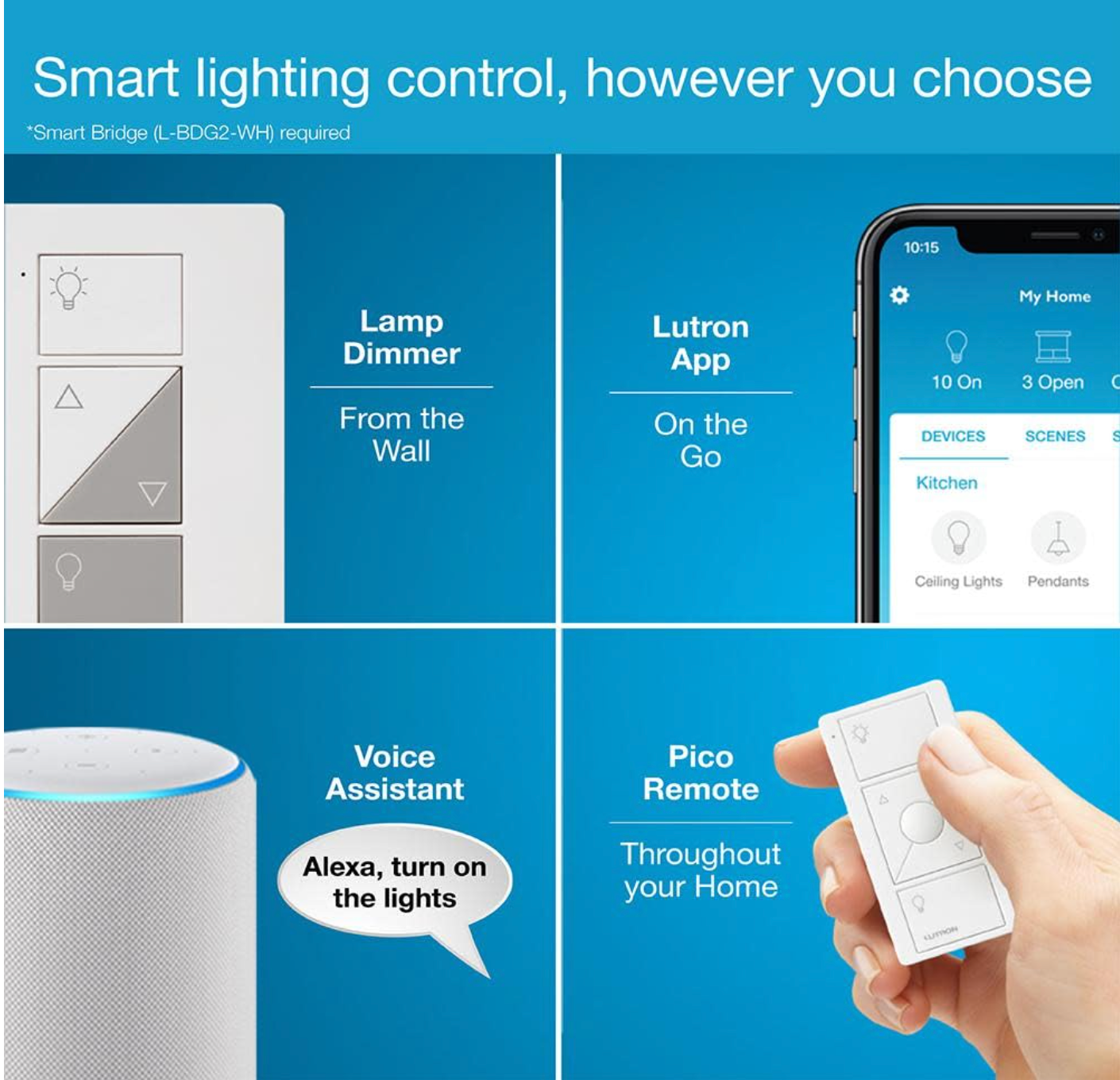 ✅ Smart Lamp Control – Dims plug-in lamps (LED/CFL/incandescent) from anywhere via the Lutron app or voice commands (Alexa/Google/Siri).
